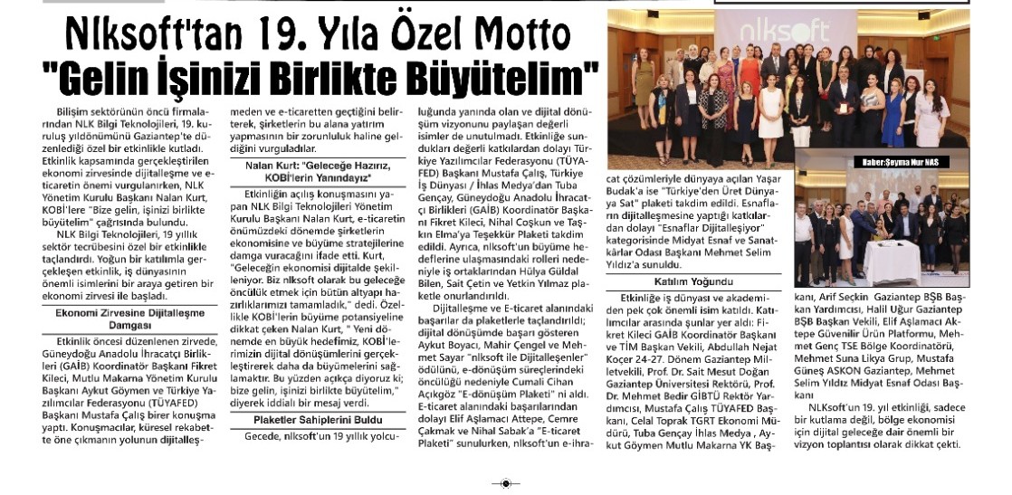 NLKSOFT 19. Yılını “Gelin İşinizi Birlikte Büyütelim” Mottosuyla Kutladı Gaziantep merkezli yazılım markası NLKSOFT, 19. kuruluş yıl dönümünü bölge iş dünyasının önde gelen isimlerinin katılımıyla gerçekleşen görkemli bir etkinlikle kutladı. Siirt ve çevre illerden yoğun ilgi gören organizasyonda, dijitalleşme ve e-ticaretin geleceği masaya yatırıldı. Program, Güneydoğu Anadolu İhracatçı Birlikleri (GAİB) Koordinatör Başkanı Fikret Kileci, Mutlu Makarna Yönetim Kurulu Başkanı Aykut Göymen ve Türkiye Yazılımcılar Federasyonu (TÜYAFED) Başkanı Mustafa Çalış’ın konuşmaları ile başladı. Konuşmacılar, rekabette öne çıkmak isteyen işletmelerin dijital dönüşüme yatırım yapmalarının artık bir zorunluluk olduğuna vurgu yaptı. Etkinliğin açılış konuşmasını yapan NLKSOFT Yönetim Kurulu Başkanı Nalan Kurt, güçlü bir vizyon mesajı verdi: “Geleceğin ekonomisi dijitalde şekilleniyor. Biz NLKSOFT olarak, Türkiye’nin her köşesindeki KOBİ’lerin dijitalleşmesine rehberlik etmeye hazırız. Yeni dönemde en büyük hedefimiz; işletmelerimizin e-ticaret ve e-ihracatta büyümesini sağlamak. Bu yüzden açıkça diyoruz ki: Bize gelin, işinizi birlikte büyütelim.” Dijitalleşmeye Katkı Sağlayanlar Ödüllendirildi Gece boyunca sektöre katkı sunan iş ortakları, medya temsilcileri ve kurumlara plaketler takdim edildi. -