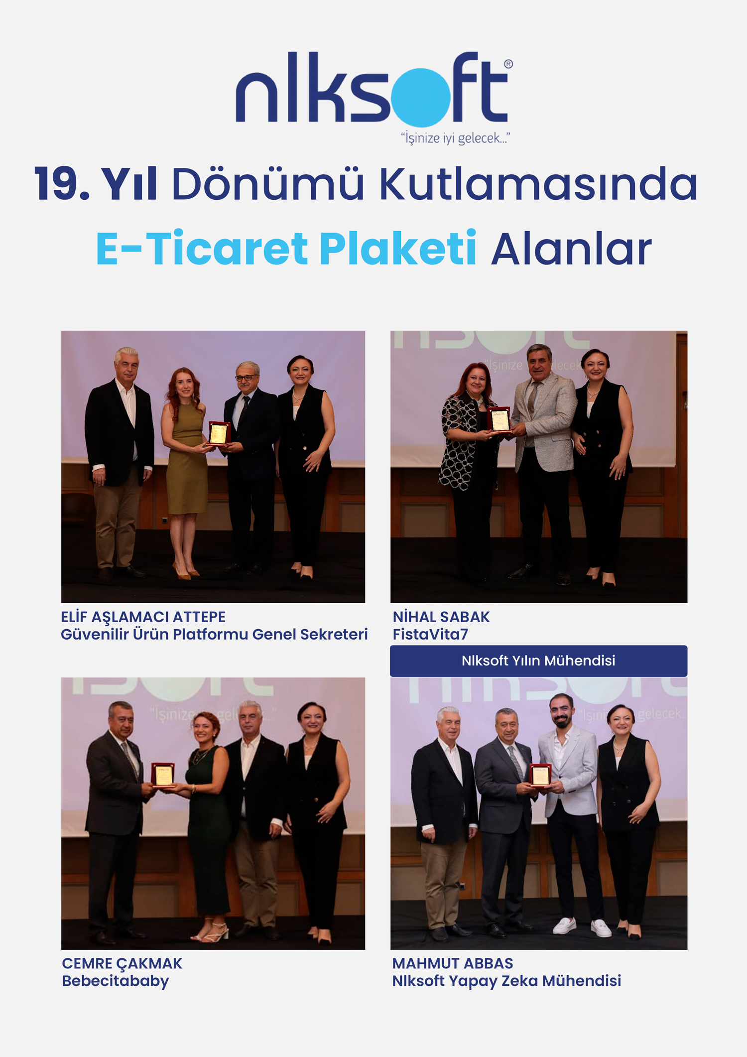 Tam 19 yıldır dijital dönüşüme rehberlik eden nlksoft ailesi olarak; e-ticaretin büyümesine katkı sağlayan, fark yaratan ve sektörüne yön veren değerli isimleri bu özel yıl dönümümüzde unutmadık. Girişimcilik ruhuyla, teknolojiyi fırsata dönüştüren bu değerli paydaşlarımız; dijital ticaretin gücünü doğru kullanan vizyoner isimler olarak 19. yılımızda özel plaketlerle onurlandırıldılar. "E-Ticaret Başarı Plaketleri", gecemizde şu kıymetli isimlere takdim edildi: - Güvenilir Ürün Platformu Genel Sekreteri Sayın Elif Aşlamacı Attepe – Tüketici güvenini esas alan, sürdürülebilir e-ticaret anlayışına katkılarından ötürü, Gaziantep İslam Bilim ve Teknoloji Üniversitesi Rektör Yardımcısı Prof. Dr. Metin Bedir tarafından E-Ticaret plaketi veridi