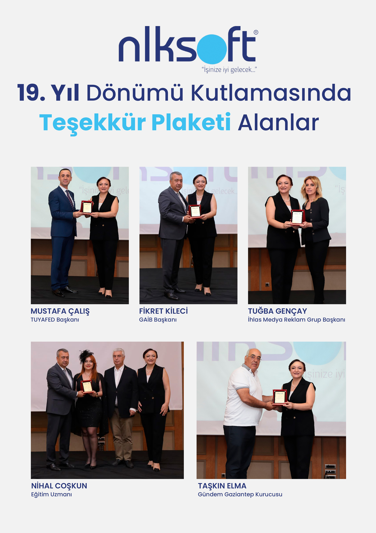 "nlksoft İşinize iyi gelecek" mottosuyla çıktığımız bu yolculukta, birlikte ürettiğimiz çözümler, geride bıraktığımız projeler ve kurduğumuz güçlü bağlarla tam 19 yılı geride bırakmanın mutluluğunu yaşıyoruz. Bu özel yıl dönümümüzde sadece başarılarımızı değil, bizi bu noktaya taşıyan kıymetli dostlarımızı da onurlandırmak istedik. Çünkü biliyoruz ki, gerçek başarı; birlikte yürüdüğümüz yol arkadaşlarımızla anlam kazanır. Bu anlamlı gecede, vizyonumuza katkı sağlayan, yolculuğumuza güç katan ve desteğini her zaman hissettiğimiz değerli isimlere "Teşekkür Plaketi" takdim ettik: - TUYAFED Başkanı Sayın Mustafa Çalış – Sivil toplumun gücünü teknolojiyle buluşturan katkıları için, Nlksoft Yönetim Kurulu Başkanı Sayın Nalan Kurt tarafından teşekkür plaketi verildi